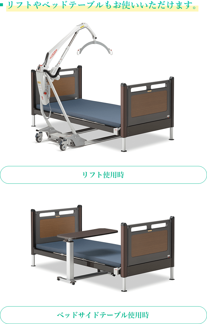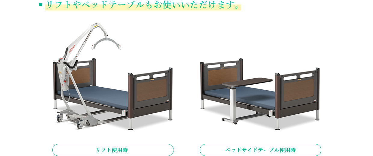 500ミリのハイローストロークで、車いすなどへの移乗が安全でスムースに行えます。介助負担の軽減がはかれます。