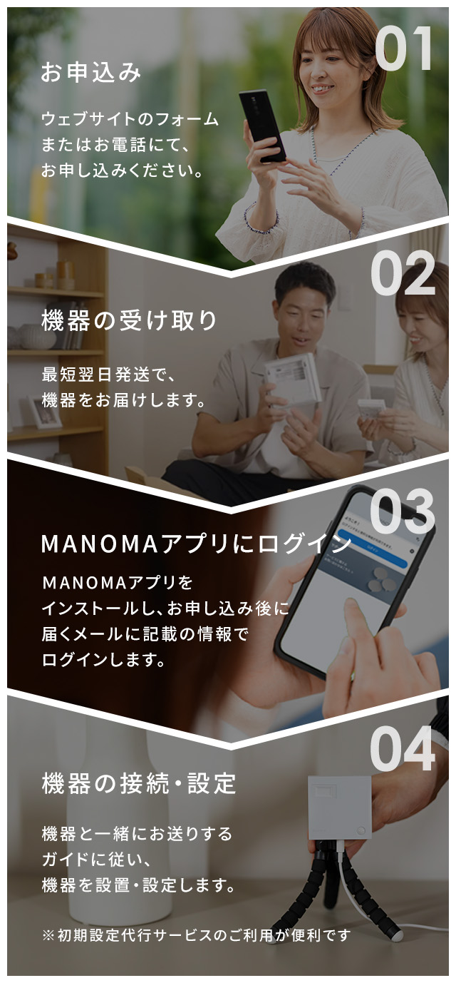 親御さまの家にインターネットがない場合は、MANOMAが同時に提供。機器にSIMカードを入れるだけで、設定も簡単です。