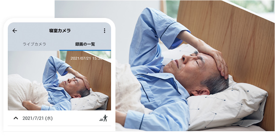 転倒時などは、カメラの録画を確認。人の動きを検知して映像が記録されるので、帰宅や起床などのタイミングに合わせてピンポイントに再生できます。