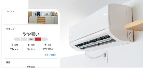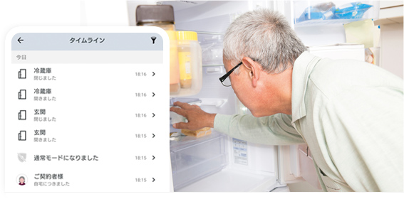 スマホで室内の温湿度や玄関の施錠状態がわかり、遠隔で操作も可能に。高齢者が気づきにくい生活リスクをサポートできます。