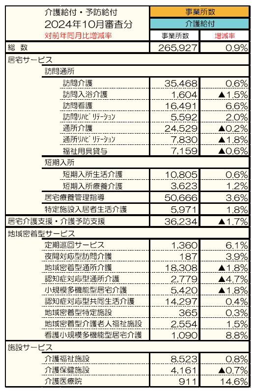 2024年10月時点の介護保険サービス事業所数(介護給付)と前年同月増減率の一覧。出典は介護給付費実態統計。
